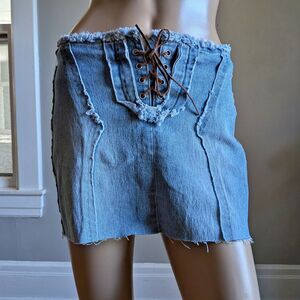 Vintage 2000s (Y2K) Lazer Jean micro mini skirt. Denim. Raw edges on waist and hem. Exposed seaming throughout. Leather tie front. Light wash. Unlined. Skirt is in great vintage condition.