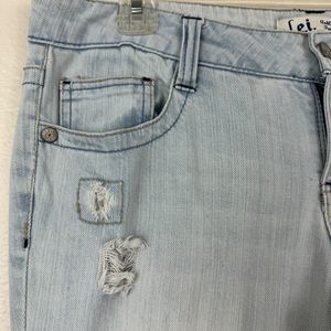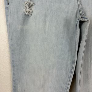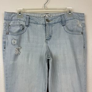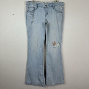 Low rise flare leg jeans. Zip and button fly. Belt loops. 5 pocket styling. Light wash blue jean denim with distressing and patchwork details. Pre-owned condition. Does have some pilling and puckering as well as some bleach spots. See photos for details. Also, size tag is worn out so unable to see size but I do believe they are a juniors 11 or modern womens 8/10. See approximate measurements: Waist Across-17 Inseam-33 Rise-8.5