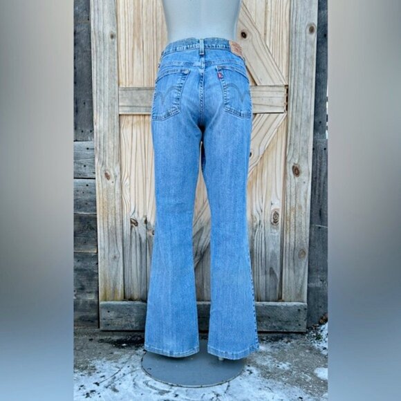 This pair of Vintage 2006 Levi's 550 Women's Stretch Denim Mid Rise Boot Cut Jeans are 15 1/2" across the front waist, 19" across the front hips, have a 10" rise and a 32" inseam.