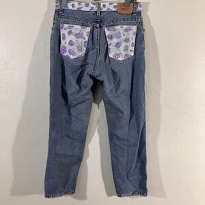 These are high quality vintage early 2000s Levi’s 550 Relaxed Fit Medium Wash denim jeans with a hand painted purple cow print. Good condition.