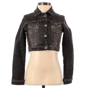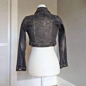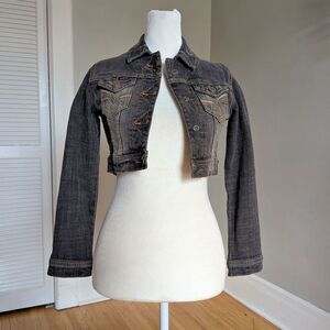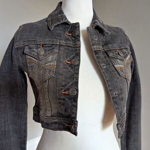 Vintage 2000s (Y2K) The Limited Too girl's grayish blue cropped denim jacket/bolero. Jean jacket. Long sleeves, button front. Embroidered detailing at front with mini rhinestones. Unlined. Good condition with light wear.