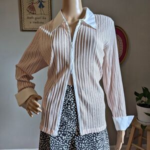 Vintage Y2K Liz Claiborne light pink zip up shirt. Oversized white collar and cuffs. Stretchy striped material. Unlined. Shirt is in good condition with two small holes in back of shirt, please see photos.