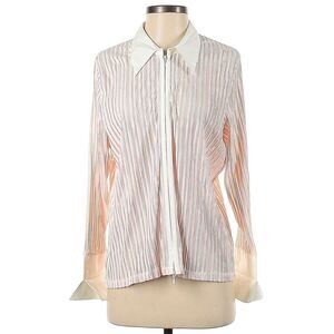 Vintage Y2K Liz Claiborne light pink zip up shirt. Oversized white collar and cuffs. Stretchy striped material. Unlined. Shirt is in good condition with two small holes in back of shirt, please see photos.