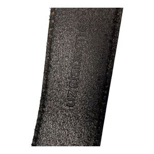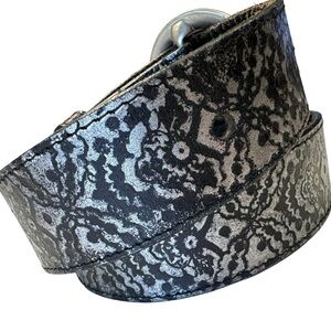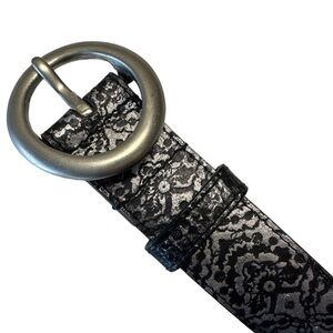 Black belt with silver design. Brushed hardware. Pristine condition. Measurements in photos.
