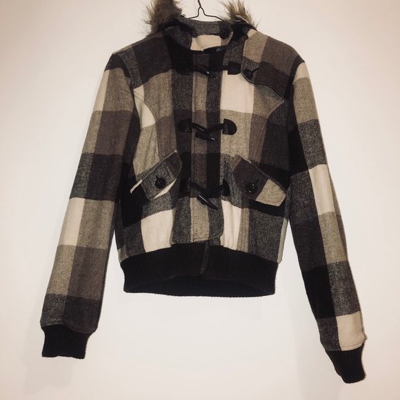 Vintage Y2K Lola Brown Plaid Wool Blend Crop Bomber Coat w/Faux Fur Trim Hood