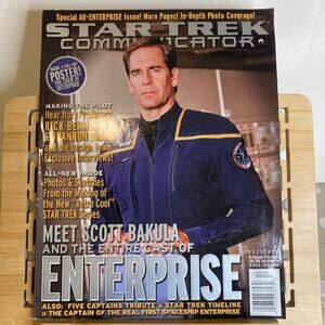 Lot of two (2) vintage Star Trek Communicators, the Magazine of the Official Star Trek Club with covers featuring Star Trek: Enterprise (ST:ENT). One owner. Generally very good condition, with some folds and creases from storage. No writing on inside. No missing pages. Some shelf wear to edges. Published by Decipher Media. May include remainder of mailing label. Issues included:
