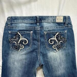 Medium wash denim with heavy contrast stitching, snowflake embroidery on coin pocket, and large rhinestone fleur-de-lis designs on both back pockets. Features whiskering and fading for a worn-in vintage look, plus bootcut leg with distressed raw hems. Soft stretch denim blend for comfort and flattering fit. Perfect Y2K / 2000s revival aesthetic.