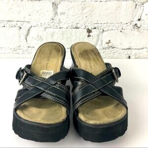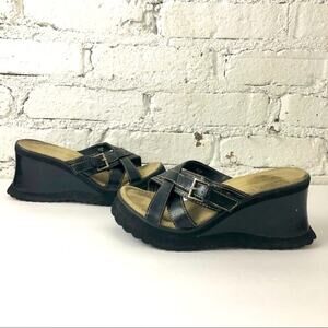 Vintage Y2K Lower East Side chunky platform strapy wedge side buckle sandals. In a woman’s size 6. In excellent vintage condition. Footbed is puffy on toe area. Some scuffing here and there due to age.
