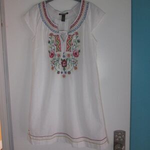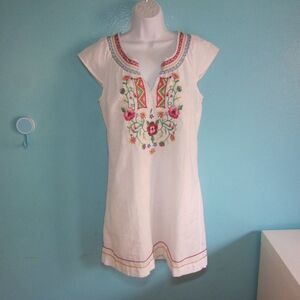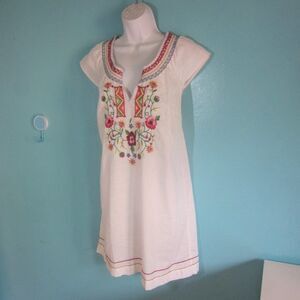 Striking white linen blend with colorful embroidery, this dress is just waiting for summer activities.