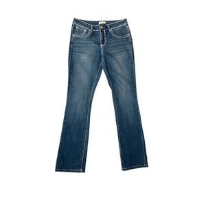 Super cute vintage bootcut flare jeans from Mudd. These jeans have a lot of stretch! Super flattering! Contrast white topstitch trim, heavily embroidered back pockets with rhinestones. Huge, oversized diamond/rhinestone buttons on the front and back. Size tag has been removed. Please check measurements. I am guessing these to be a 3/4. Great condition! No puckering, a few small rhinestones on back pockets missing but not noticeable.