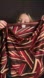 Striking vintage Y2K top from Poetry Clothing featuring a bold geometric stripe pattern in rich burgundy, tan, and black tones with subtle metallic threading for a hint of sparkle. Designed with a flattering asymmetrical cut, tie detail at one sleeve, and a soft cowl neckline. Fabric has comfortable stretch for a body-skimming fit.