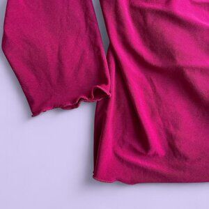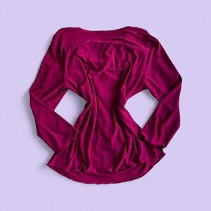 Vintage Y2K long sleeve magenta top featuring a soft draped cowl neck and built-in faux lace cami insert with subtle gold glitter detail. Stretchy and comfy material with an early 2000s fit. Brand and tag unknown (tag cut), fits like a Medium. No major flaws noted.