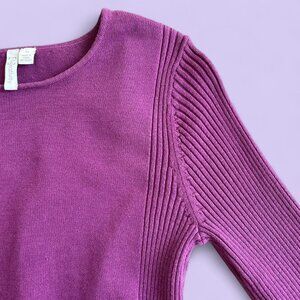 Vintage Y2K long sleeve ribbed sweater by Relativity in a rich magenta purple hue. Made from thick, durable 100% cotton with ribbed sides and hem for a flattering, slightly fitted silhouette. Features a round neckline, soft stretch, and timeless minimalist style.