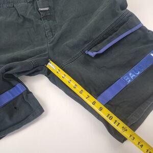 This product is a pair of vintage Y2K Marithe Francois Girbaud strap jorts distressed shorts in black, size 40. These relaxed fit shorts are made of dark wash cotton canvas fabric with a solid pattern, perfect for casual occasions. The distressed accents and cargo style add a unique and retro touch to the overall design. With easy care features and a regular fit, these shorts offer a comfortable and stylish option for men's fashion.
