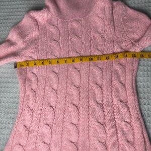 Maurices women’s cowl neck sweater. Marked size small; please refer to measurements provided to compare with modern sizing. Color is soft pink. Cable knit front. Fabric shows some wear and the sleeves are a little stretched out - see photos. Judging from the tags this vintage garment is probably from the late 90s/Y2K era.