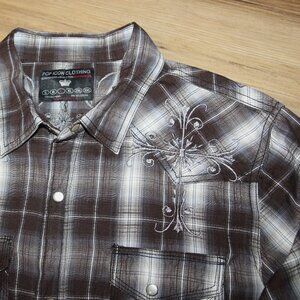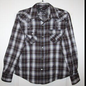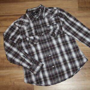 Men's SIZE LARGE pearl snap shirt. Gently worn just twice, in excellent pre-owned condition! Plaid shirt in shades of black, grays, white and brown with ornate gray embroidery at front and rear. Made of 100% Cotton.