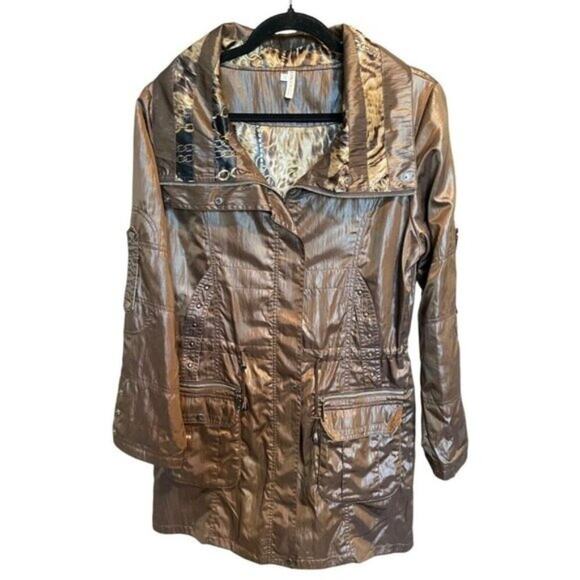 Lindi jacket, medium size jacket, metallic brown coat, animal print lining, women's outerwear, zipper jacket, multi-pocket jacket, polyester coat, stylish jacket, brown fashion, roll-up sleeves, adjustable waist jacket, metallic jacket
