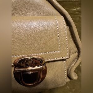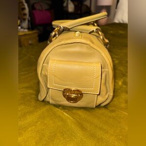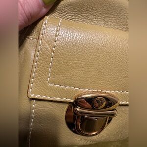 Beautiful doctor’s bag shape, excellent condition. There are some stains on the side pockets where I believe it was improperly stored at one point, they may come off but I haven’t tried. They are hardly noticeable. Gold hardware and a beautiful light pastel yellowish green. Two push lock pockets on each side. Leather is soft and squishy, but still holds it shape well when unstuffed.