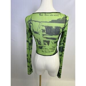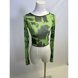 Vintage Y2K Micro Mesh Green Black Print Long sleeve Woman's top Small Brand tag is missing