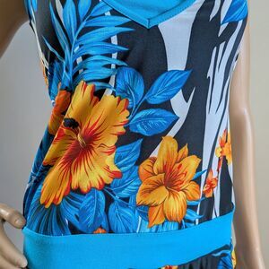 Vintage 2000s (Y2K) French micro mini dress. Can also be worn as a top. Halter neck with plastic O-ring detail at bust. Drop waist, ruffle skirt. Blue and orange. Unlined. Dress/top is in good condition with light wear including small hole at bust, light discoloration at bust and scuffs to O-ring. Please see photos.
