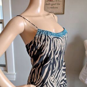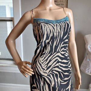 Vintage 2000s (Y2K) Positive Attitude maxi dress. Prom gown. Sleeceless, spaghetti straps. Black and beige animal/zebra print. Blue beaded detail on bust. Lined. Dress is in good vintage condition with a light run on the front bust. Possible other runs in fabric, but not seen. Please see photos.