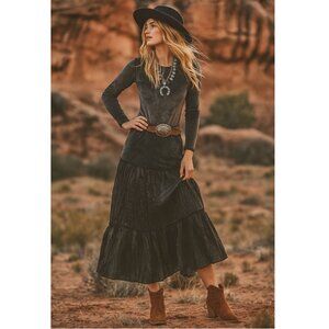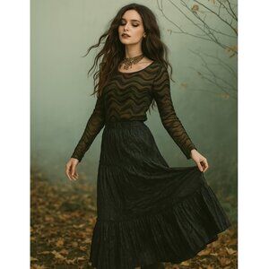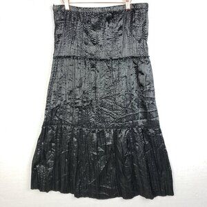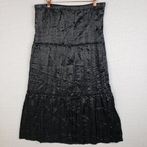 Vintage Y2K Midi Skirt Satin Crinkled Black Broomstick Tiered Goth Western Boho