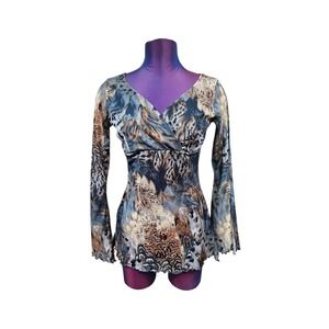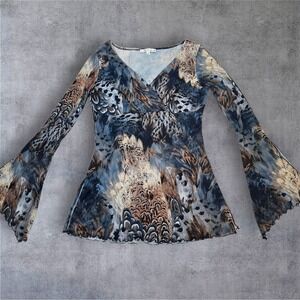 In excellent condition Vintage Y2K Moa Moa Feather Print Long Flared Sleeve Top V-Neck Fairy Medium F83