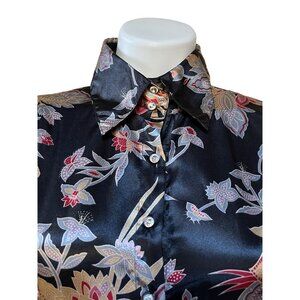 This vintage Y2K Wet Seal blouse features a bold Jacobean floral print in a luxurious, liquid satin fabric. Its peplum design and ribbon tie waist offer a flattering silhouette, while the button-up front adds a touch of classic elegance. Vintage 2000s, New with Tags, Liquid Satin Shirt, Tie Ribbon Belt, peplum Waist, Collar, Rhinestone buttons, short puff sleeve