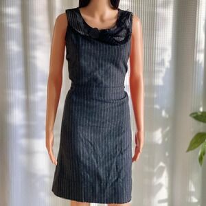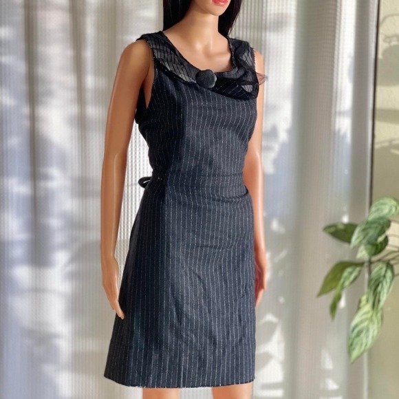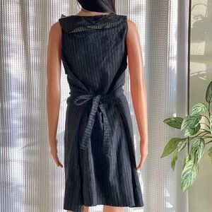 Elegant sleeveless pinstripe dress with a unique design. This black and white dress features a round neckline accented with a layered fabric detail and a decorative button. The dress has a flattering silhouette, cinched at the waist with an adjustable tie back for a customized fit. The material is a wool blend, offering both structure and comfort to the knee-length style.