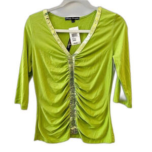 Vintage Y2K NWT Lime Green Sequin Top Women’s Large 3/4 Sleeve Ruched Gold