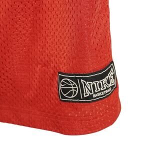 Retro Nike Basketball mesh jersey in vibrant red with black and white contrast trim and varsity-style logo print. Lightweight, breathable mesh fabric with a relaxed athletic fit — classic early-2000s style perfect for layering or casual streetwear looks. Tag shows youth medium; please refer to measurements for best fit.