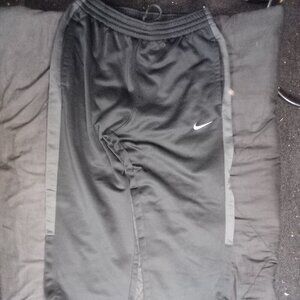 Vintage Y2K Nike Dri-Fit Striped Sweat Pants Joggers Trainers - Side Pockets, Zippers At Ankles - Size Medium, Measures Adjustable Drawstring Elastic Waist(Flat)=15" Inseam=31" Front Rise=14" - Excellent Condition, No Flaws - Black Color Pants With Gray Stripe