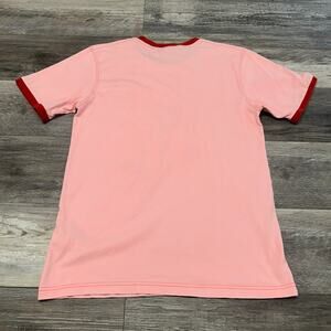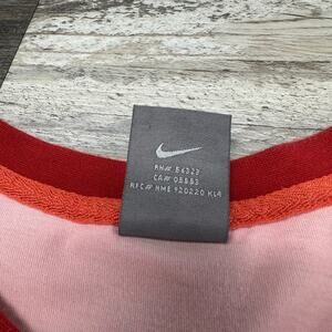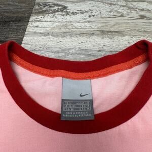 Lightweight, 100% cotton, pink orange white, red trim, short sleeve, crewneck, front graphic print, embroidered Nike Sportswear logo, Nike Swoosh logo, comfort, durable, casual, sporty, Y2K revival, cultural nod, graphic tee.