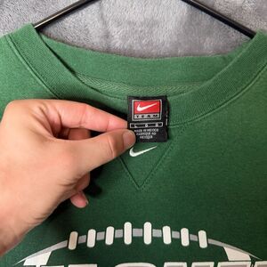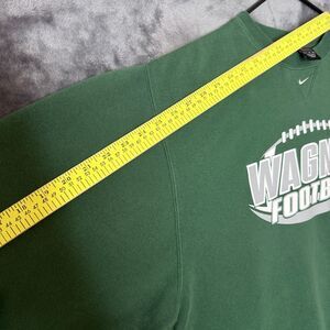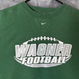 The product is a vintage Y2K Nike Teams Tag Center Swoosh Wagner Football Pullover Sweater. This green sweatshirt, with a size L, features a classic pullover style and is designed for football enthusiasts. Made by Nike, a renowned brand in clothing and athletic wear, this sweater is a stylish and comfortable choice for men looking to represent their love for the sport.