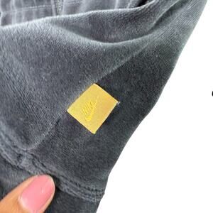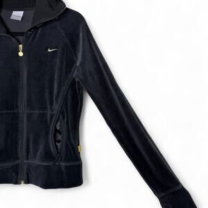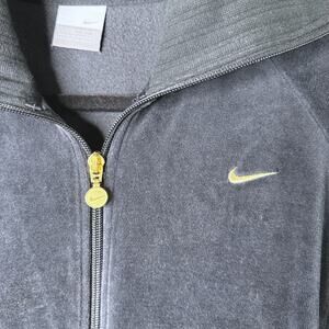 Vintage Y2K Nike velour zip-up track jacket with rare gold hardware, embroidered swoosh logo, and rainbow flag side tab.