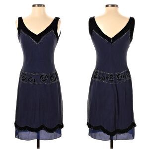 Vintage 2000s (Y2K) Nine West blue silk mini dress. Drop waist, flapper/1920s look. Blue velvet detailing and floral beaded sequins throughout. Sleeveless, lined. Zip up back. Dress is in good condition with small pulls to crepe silk throughout, please see photos as this wear is very light.