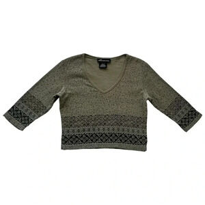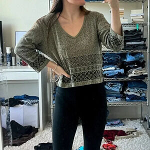 super cute green & black floral print cropped top with 3/4 sleeves and a v neckline