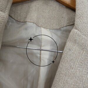 Vintage Y2K (Fall 2005) Old Navy Brand wool blend blazer in a beige chevron tweed weave. Features beaded floral embellishment on the collar for a unique touch, two-button front, front patch pockets, and full lining. Classic academia and preppy vibes with a slightly cropped fit—perfect for fall layering over dresses, turtlenecks, or jeans.