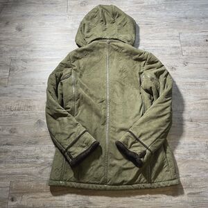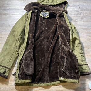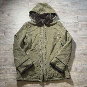Vintage Y2K Opium Suede Style Jacket Medium Fuzzy Fur Hood Owens Green Brown