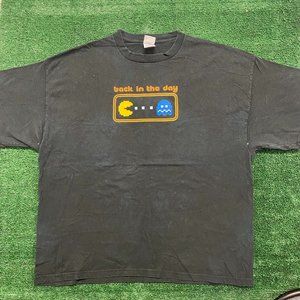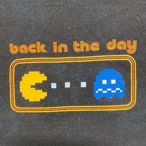 Sun faded black short sleeve crewneck t-shirt by Delta with yellow Back In The Day retro Pac Man gaming graphic. Baggy fit. Essential 2000s arcade game tee.
