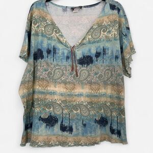 Boho plus-size gem 💙 Vintage Y2K paisley tee in blue + tan with keyhole tie-front neckline + frilly trim accents. Flowy + comfy cotton. Size 3X, used good condition. Bust 26” across