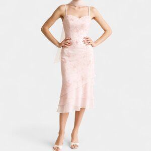 Y2K 2000s coquette fairy baby pink knee length bodycon dress. Floral beaded throughout. Spaghetti straps. Sweetheart neckline. Padded. Shawl not included