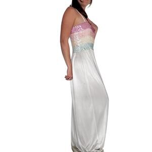 Vintage Y2K Pastel Sequins & Polyester White Dress Full Length Gown Elastic