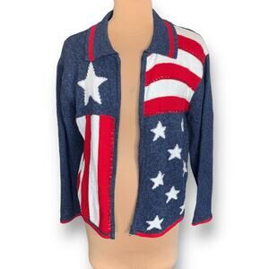 Tiara International Patriotic Flag Sweater Large Zip Front 2004 USA Stars Stripes