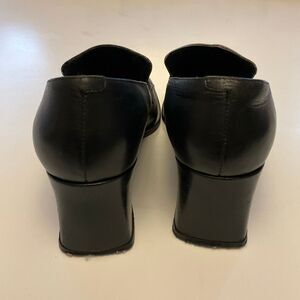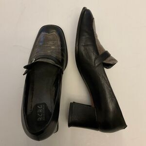 Y2K Vintage BCBG Max Azria Block heel Slip on Loafer. Brogue Size 7. Pilgrim look! Colorblock black with tan speckled toebox. Decorative buckle and strap. Genuine Leather. 2” Block Heel. These are originally my shoes. I loved them for years, and kept good care of them. Sadly, heels are undoable anymore!!! Spot on right shoe top. See photo. #brogues #pilgrim #vintagey2k