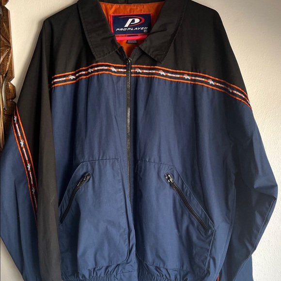 Broncos Jacket with black and navy design. Features zippered pockets and orange accents. Excellent condition and clean. Non smoking home. 26” pit to pit. 28” Long