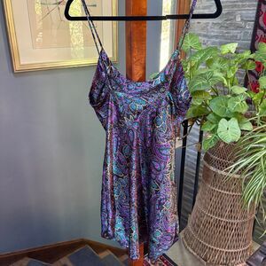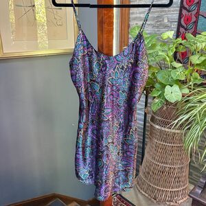 The dreamiest little slip dress out of your favorite y2K wet seal / dELiA’s catalogue. This slip is in perfect condition, hugs in all the right places and has a darling rounded hem with a slit. I love the dark romantic, 90s witchy colors in the paisley pattern.