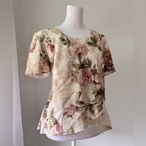 This elegant vintage Y2K blouse by R&M Richards features a cream base with a romantic floral pattern in pink and red tones. The short sleeves and ruffled asymmetrical hem add a touch of sophistication, making it perfect for both casual and dressier occasions.