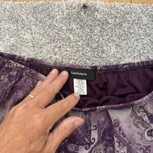 Purple/berry patterned overlay features a layered, asymmetrical cut on blouse with flattering drape. Pull-on elastic waist skirt for easy fit.