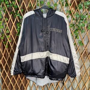 Vintage / Y2K Raiders, Oakland, NFL football nylon material style front and back hand double sided multiple graphic reverse bowl half zip jacket heavyweight sportswear winter wear on Reebok Tag essential